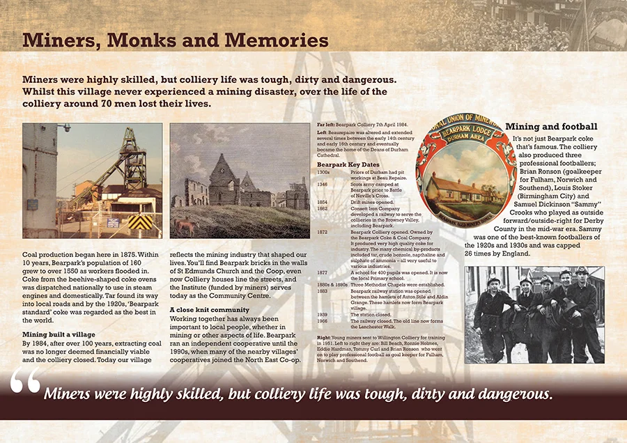 Bearpark Community centre is at the hub of the local village, a red brick building originally built in 1921 as a miners welfare hall. An old pit wheel stands in front of the building, a memorial to the village’s mining history. We were asked to produce two panels exploring the mining history as well as the story of the Scottish King being caught by his reflection as he hid under the bridge here.