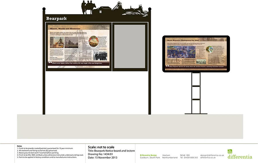 The panels were produced in GRP and one was framed in steel with a laser cut image of the heritage of the local area. The other was produced in our ARC lectern design. We worked with Cath Brew of Red Plait Interpretation once again and she produced some lively and entertaining text to support the images on the panels.