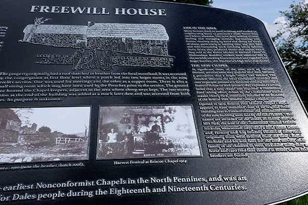 Opened in 1905, Briscoe Free Mission Gospel Chapel appears to have remained close to its original roots. Standing near to Freewill House, the foundation stones of the new building were laid by the fund raisers. Their names are recorded on the stones including that of a Mrs Park, the wife of the Cotherstone Station Master.