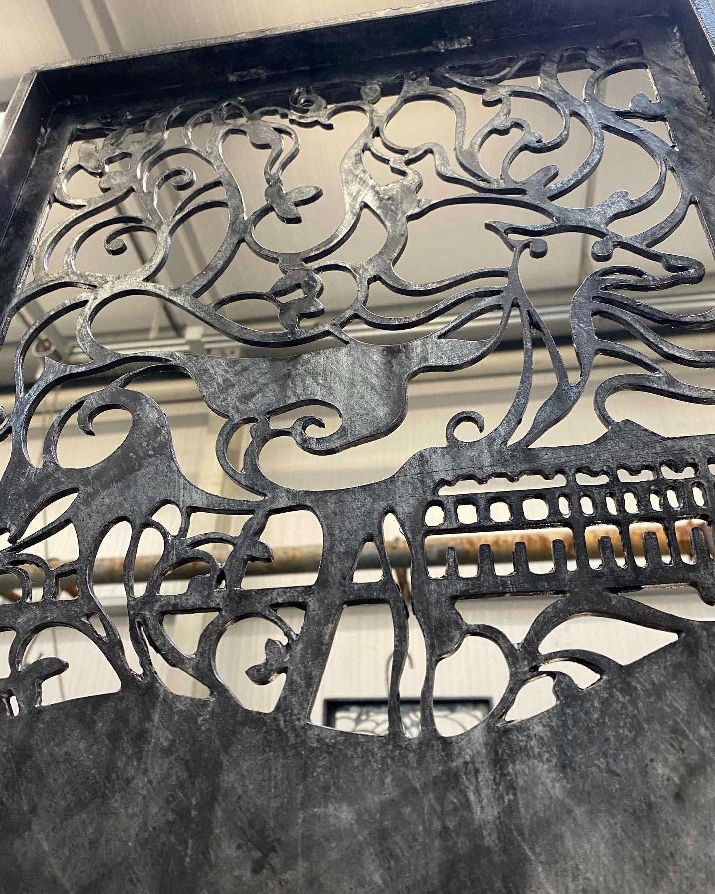 Once the drawings are complete in Concepts I upload to Adobe Illustrator and from there it is a simple process of combining the images with a frame. I then rasterise the whole thing and then vectorise it - this simplifies all the different elements into one flat easy to edit vector. Once I a happy with the curves and pieces of laser cut artwork I export as a DXF and hand off to the laser cutters or fabricator - in this case it is Chris Brammall of CB Arts who I have worked with for over 20 years.