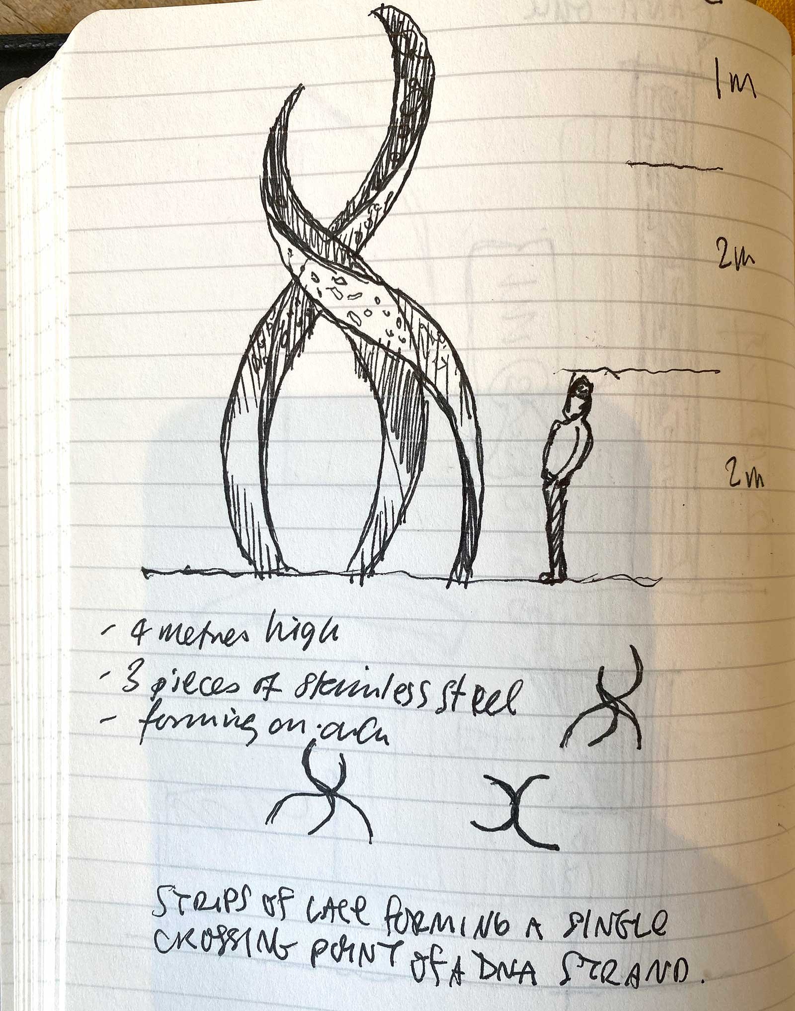 The next stage was to start to realise the design. This is where the amazing Chris Brammall of CB Arts came in. Early on in the project I emailed Chris the first sketch and asked him what he thought - could he make it - the answer was a resounding yes and I would love to - although it will be a challenge. The form not only twists but has a variable shape and three pieces coming together. And of course it has to stand up! Chris then made a model to scale and he plotted the dimensions and distances in order to create a construction drawing which he shared with me. I could then import this into an software to create a 3D model so I could interrogate the form and see how it looked from different angles.